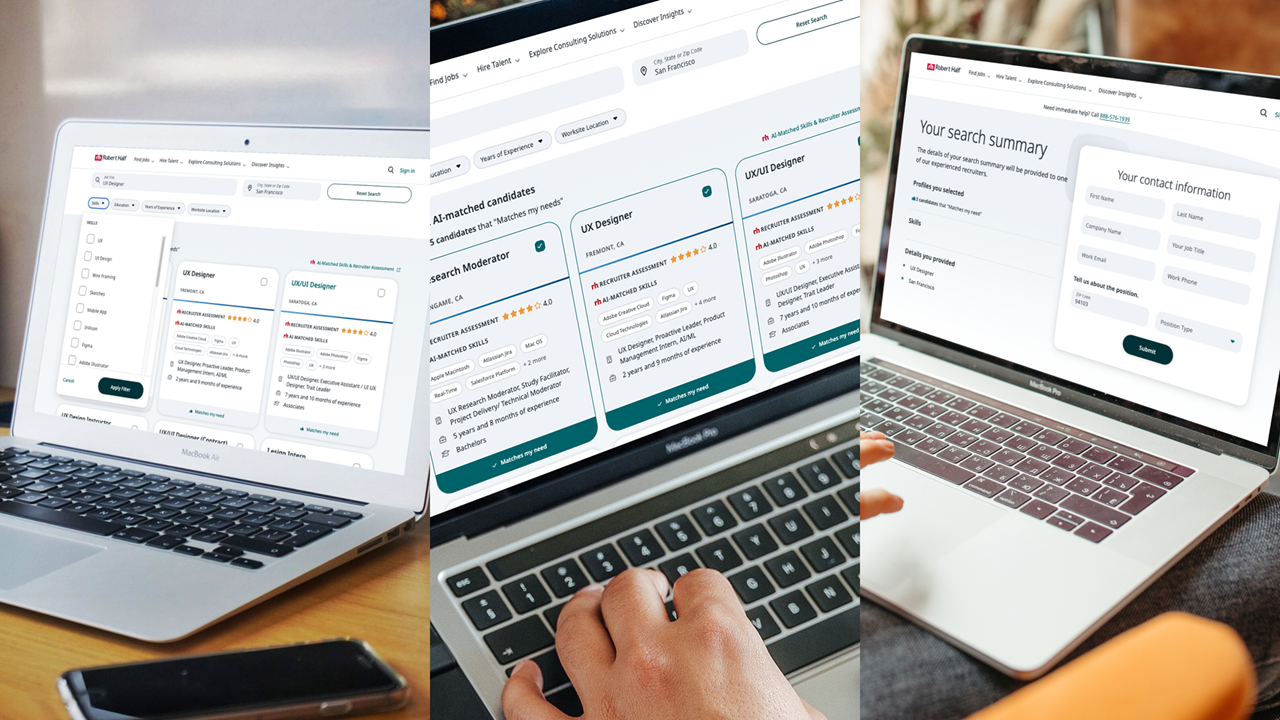 Built UX function at Robert Half and Protiviti, later expanding to Research, Product Design, Digital Brand, and DesignOps; scaled to 75+ global practitioners.